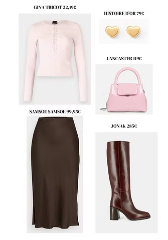 Pour un look de Saint-Valentin sobre et élégant, optez pour une jupe satinée droite, un top moulant, des bottes hautes, une paire de boucles d'oreilles discrètes et un petit sac uni. Ici, nous avons choisi d'associer la couleur rose poudrée et son côté romantique avec la couleur marron pour son aspect réconfortant.