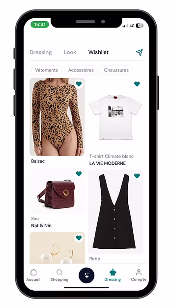 Pour retrouver votre wishlist, ou autrement dit la liste de vos pièces favorites, allez dans l'espace "dressing" de l'application. Vous pouvez voir que tous les vêtements et accessoires que vous avez likés sont regroupés dans l'onglet "wishlist".