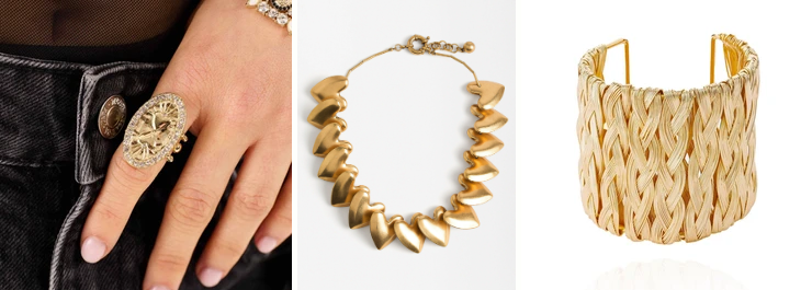 Pour adopter cette tendance, portez un look sobre, comme une robe noire élégante, et ajoutez de gros bijoux dorés, comme un collier plastron ou une grosse manchette, pour accessoiriser votre look avec style !